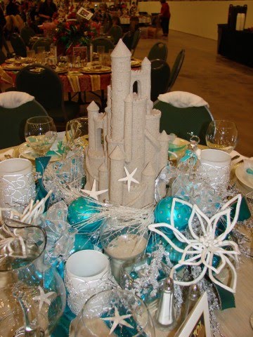 Each table had a favor for the guest to take home. I got a neat Christmas nativity ornament. The table above with the sand castle on it … well, each of her chairs was draped with a beach towel. She decorated with beach towels…how cute is that?!?