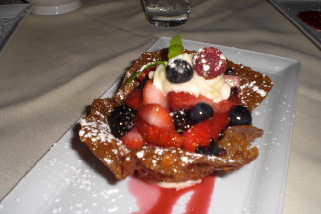 Dessert defies description. Caroline and Stephanie had these chocolate somethings that they loved. I had a fruit cup in a delicious edible cup with white chocolate mousse and berries in it.