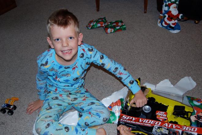 Next we opened the gifts. Instead of stockings, this year Grandma and Grandpa put gift sacks on the tree with gift cards inside for Wendy’s.