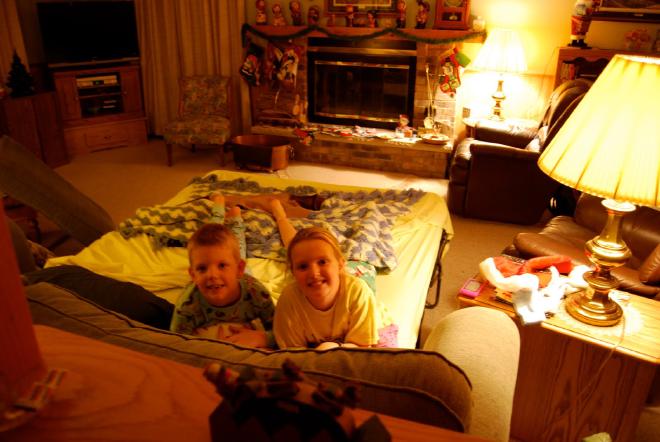 Savannah and Jacob requested sleeping by the fireplace … so they could try and see Santa.