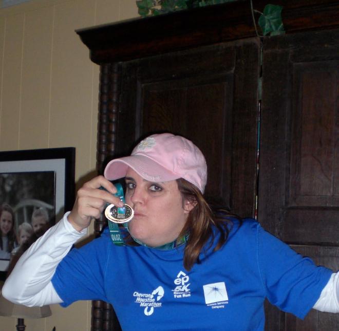 The pictures from the actual race don’t get posted until later this week, but I did take one at home with my medal after the race.