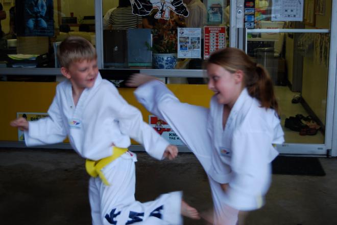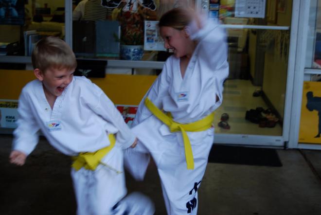 But I didn’t imagine my kids would be doing real kicks while wearing taekwondo uniforms.
