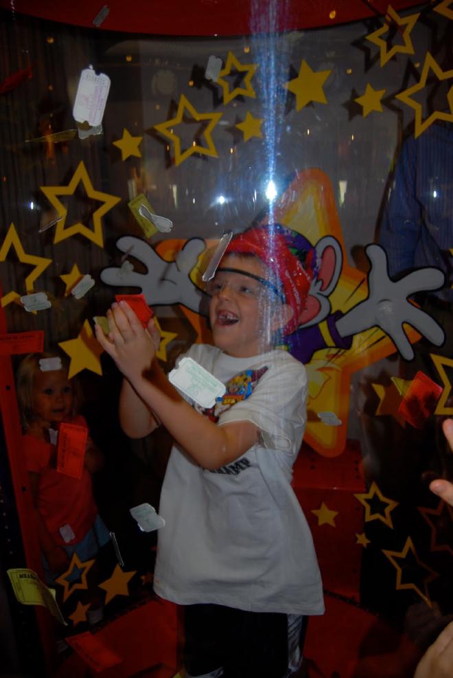 He had seven friends and it was just the right size party. It was relaxed and fun … and exactly what he wanted. The thing he was most excited about was going into the Ticket Blaster machine. The birthday child stands inside and it blows tickets and you get to keep as many as you can catch. HE. LOVED. IT.