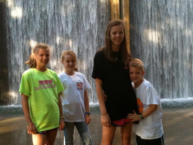 As we left I remembered that on every list of “things you shouldn’t miss when you have visitors come to Houston” is the Transco water tower which is right next to the Galleria. The kids had never seen it so we drove by to take a peek. As I was driving home I decided that was lame and we turned around and went back and got OUT of the car. I mean, this is the closest thing Houston has to Niagara Falls and it is really neat to see and stand up close to it. So we did.