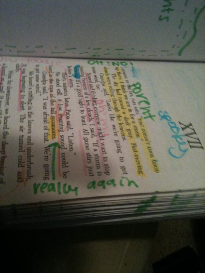 In school now the students are required to “annotate” the book while they read. (This means I have to buy four copies of this book over the years since you have to annotate a fresh copy.) This is what the page looks like that has been read: