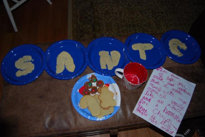 After church we went to Olive Garden for dinner and it poured down rain. When we got home Savannah wanted to make cookies for Santa. She ended up cutting out each individual letter by hand.