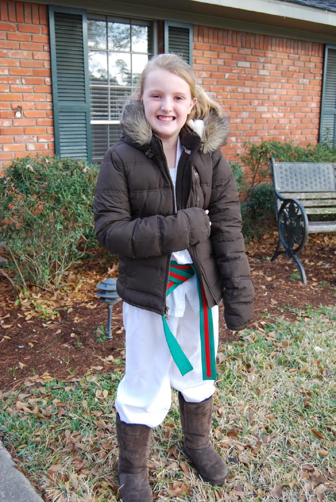 It is FREEZING (actually below freezing) in Houston today. SO cold. This is how Savannah looked on her way to taekwondo yesterday. It just struck me as funny b/c usually she is barefoot and jacketless.