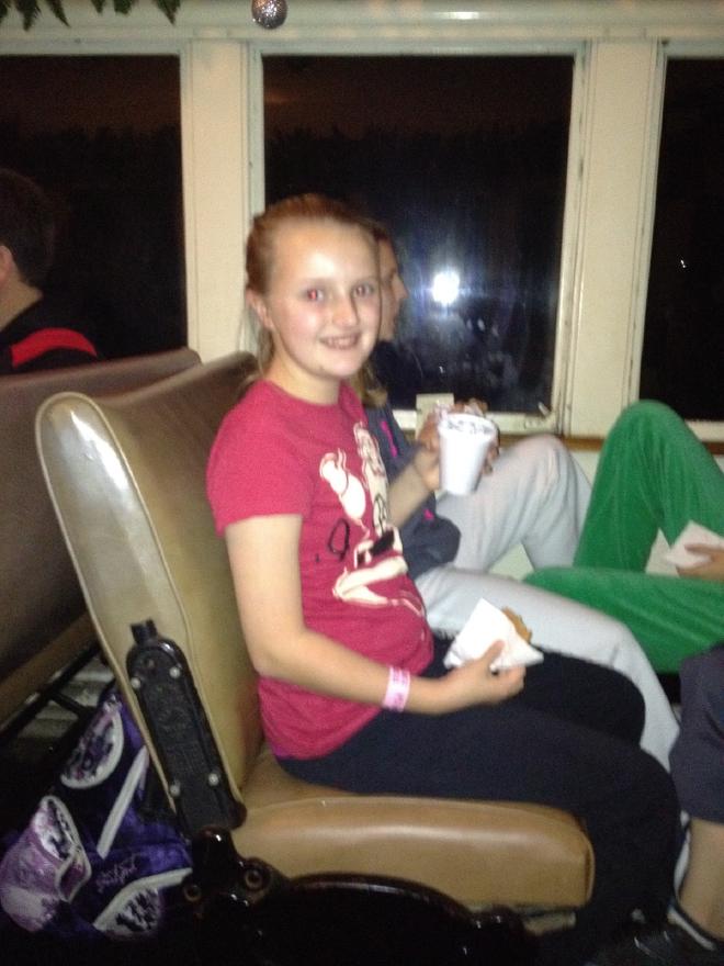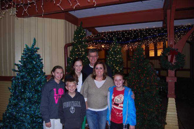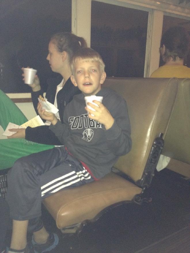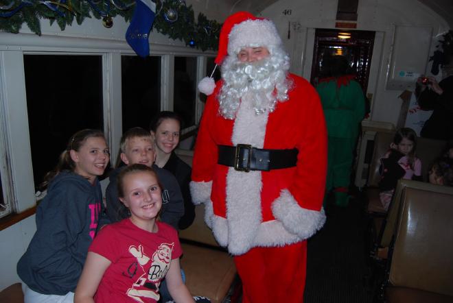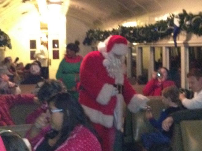 For some reason I can’t make these pictures go in order, but they read the story over the loud speaker, we got cookies and hot chocolate and before we knew it the train arrived at the North Pole. Lights were everywhere and Santa was waving. He then got on the train and gave a bell to the kids and rode back with us while we all sang Christmas carols. Most people had on their pajamas like in the book … our kids wore sweats … does that count?