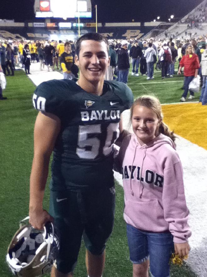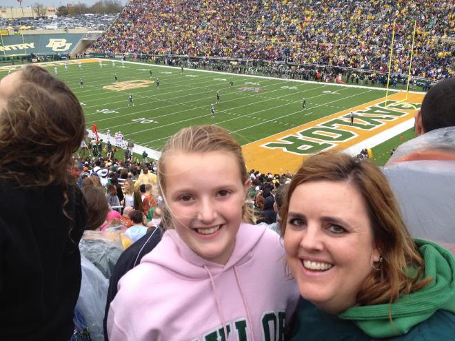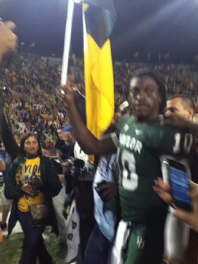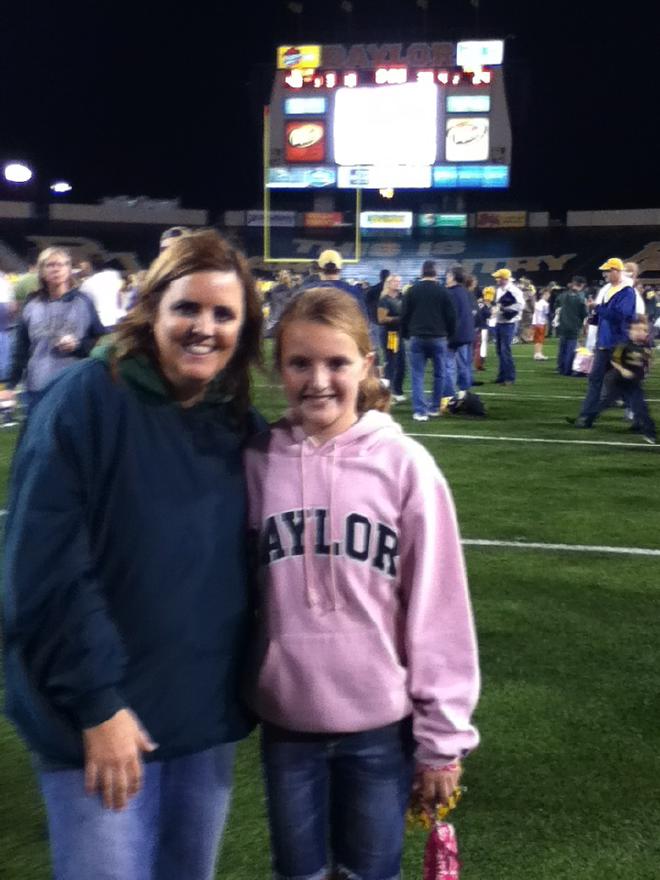She was pretty easy to keep up with since she was wearing pink in a sea of green and gold but all of a sudden I couldn’t find her. I saw what looked to be a parade. And there … standing right next to RG 3, as he carried the Baylor flag around the field was Savannah. I almost fell over laughing.